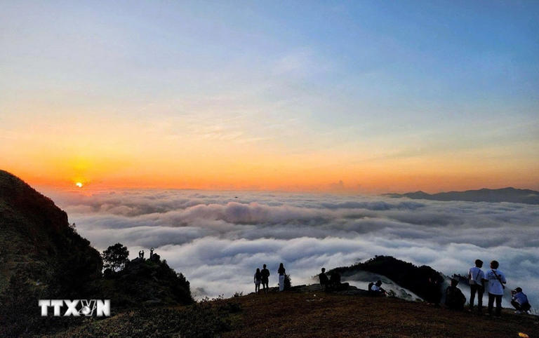 Trong làn sương mờ ảo, những tầng mây trắng cuồn cuộn như sóng biển, đồi cỏ xanh trải dài bất tận dần dần hiện ra khi Mặt Trời dần ló dạng từ phía chân trời.