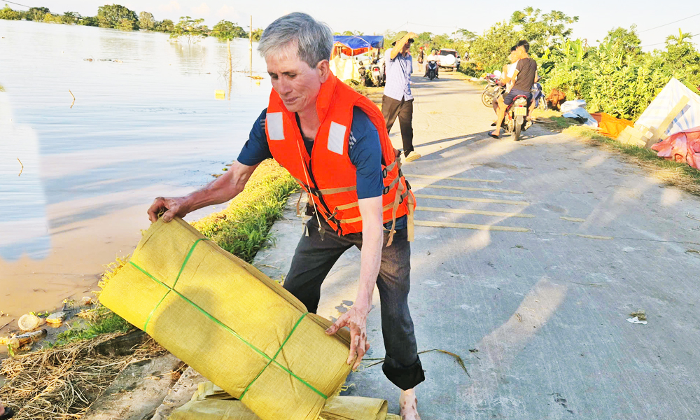 Nhiều người dân cùng tham gia bảo vệ đê. |