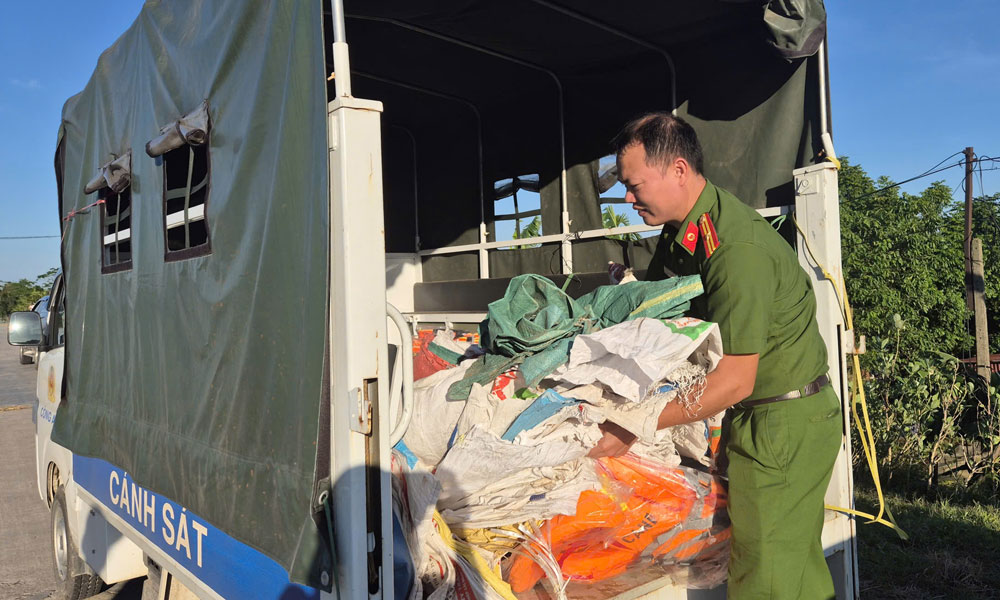 Vật tư phòng chống thiên tai được tập kết ngay tại vị trí đắp đê. |