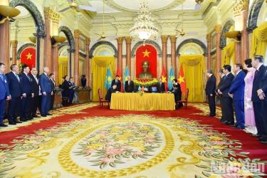 Ngay sau lễ đón chính thức và hội đàm, sáng 21/8, tại Phủ Chủ tịch, Chủ tịch nước Võ Văn Thưởng và Tổng thống Cộng hòa Kazakhstan Kassym-Jomart Tokayev cùng Đoàn đại biểu cấp cao chứng kiến Lễ ký các văn kiện hợp tác giữa hai nước trên nhiều lĩnh vực.